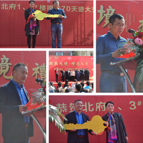 在氣勢雄渾的軍樂鑼鼓隊和精彩紛呈的舞獅表演之后,北府提前交房儀式正式開始。泰盛恒地產伏總、業主代表及物業公司周總分別進行致辭并進行交接鑰匙儀式,隨后物業同仁進行服務宣誓。接著在喜慶的鞭炮聲中,現場業主開啟溫馨交房之旅。