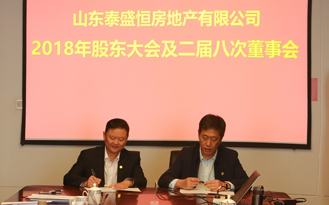 2018年3月30日上午9時,泰盛恒地產2018年股東大會及二屆八次董事會在二號會議室順利召開。會議由公司董事長馬亞鵬主持,陜西金泰恒業股東代表馬亞鵬、華鵬集團股東代表孫鵬、公司董事趙利捷、孫磊出席了本次大會,監事會主席王雅萍、監事徐愛斌及公司經營班子成員列席會議。